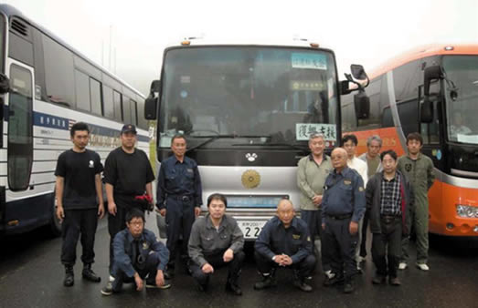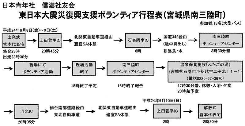午後11時、宮本代表宅に信濃社友会参加者と有志協力者13名が集合し、出発式。午後11時30分宮城県南三陸町に向けバスにて長野県上田市を出発。上信越自動車道→北関東自動車道→東北自動車道→三陸自動車道へと進む。