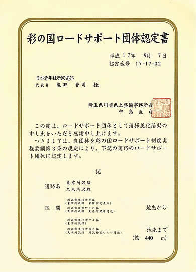 私たちが取り組んだ市内清掃美化活動が、回を重ねるごとに参加者が増えていますが、この度埼玉県から「彩の国ロードサポート団体」に認定されたことは、これからの活動に大きな励みとなります。私たちは日本青年社が掲げる「国家社会への貢献」の一環として今後とも頑張ってまいります。