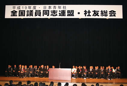 爽秋の9月16日、「日本青年館(大ホール)」(東京都新宿区)で開催された日本青年社恒例の「全国議員同志連盟・社友総会」(以下「全国社友総会」云う)は、機関紙「青年戦士」(第407号)で述べた通り、全国の地方議員で構成される“議員同志連盟”と日本青年社の思想理念と活動指針に共鳴をいただく多くの方々によって構成される“全国社友会”が年に一度、実践活動に取り組む日本青年社とともに一堂に会してそれぞれの年間活動の総括と、更なる活動のの取り組みを発表する恒例行事だが、本年の「全国社友総会」は、昭和36年の結成以来46年の歳月を歩んできた日本青年社が、「旧来の殻を破り、新たな理想に向けて大きく羽ばたく」ことを内外に明らかにすることを最大のテーマとして開催。